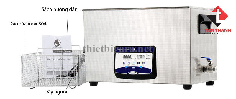 Bể điện phân làm sạch chi tiết máy BJP-100S được trang bị giỏ rửa inox 304, sách hướng dẫn & dây nguồn chịu nhiệt.