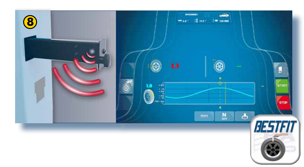 Sự hiện diện của cảm biến RUN-OUT sonar tự động kích hoạt chức năng phần mềm BESTFIT mới cho biết trên màn hình điểm lăn bánh cao nhất và gợi ý cách lắp nó vào trung tâm của xe, trước khi siết chặt các bu lông, để triệt tiêu các rung động trực tiếp trong quá trình lắp ráp trên xe.