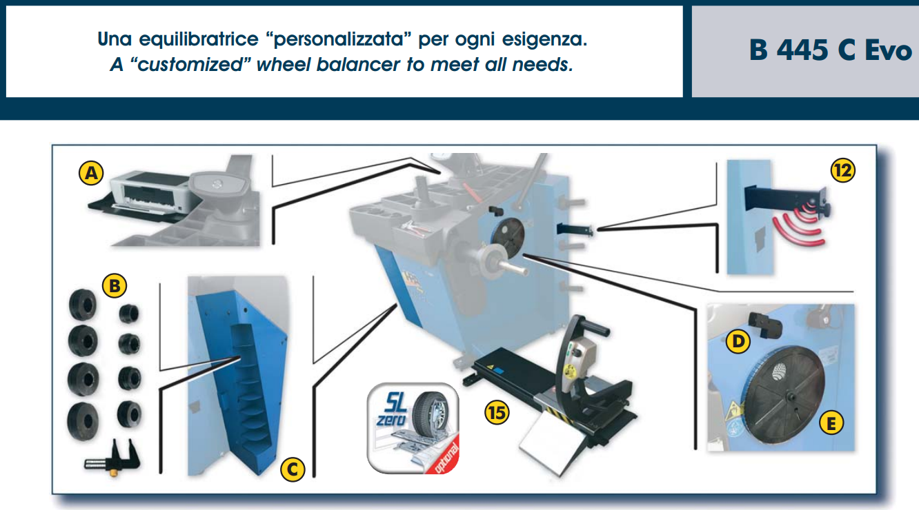 14. TYRE SET CONTROL PROGRAM: Bộ thiết bị chẩn đoán lốp xe đặc biệt. Khi tất cả các lốp xe được lưu trữ, B445 C EVO gợi ý cho Khách hàng lựa chọn vị trí tối ưu trên xe tạo sự thoải mái và an toàn tối đa.