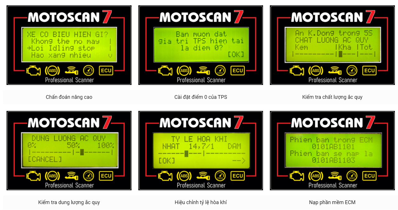 | LỰA CHỌN TIÊU CHUẨN CỦA MOTOSCAN 7 | PHIÊN BẢN 1 DÒNG XE (mã sản phẩm: MT007H MT007Y MT007S MT007PG) | MOTOSCAN 7H/ 7Y/ 7S Hỗ trợ cho 1 nhà sản xuất xe: HONDA (MOTOSCAN 7H) YAMAHA (MOTOSCAN 7Y) SYM (MOTOSCAN 7S) | 8.300.000 |