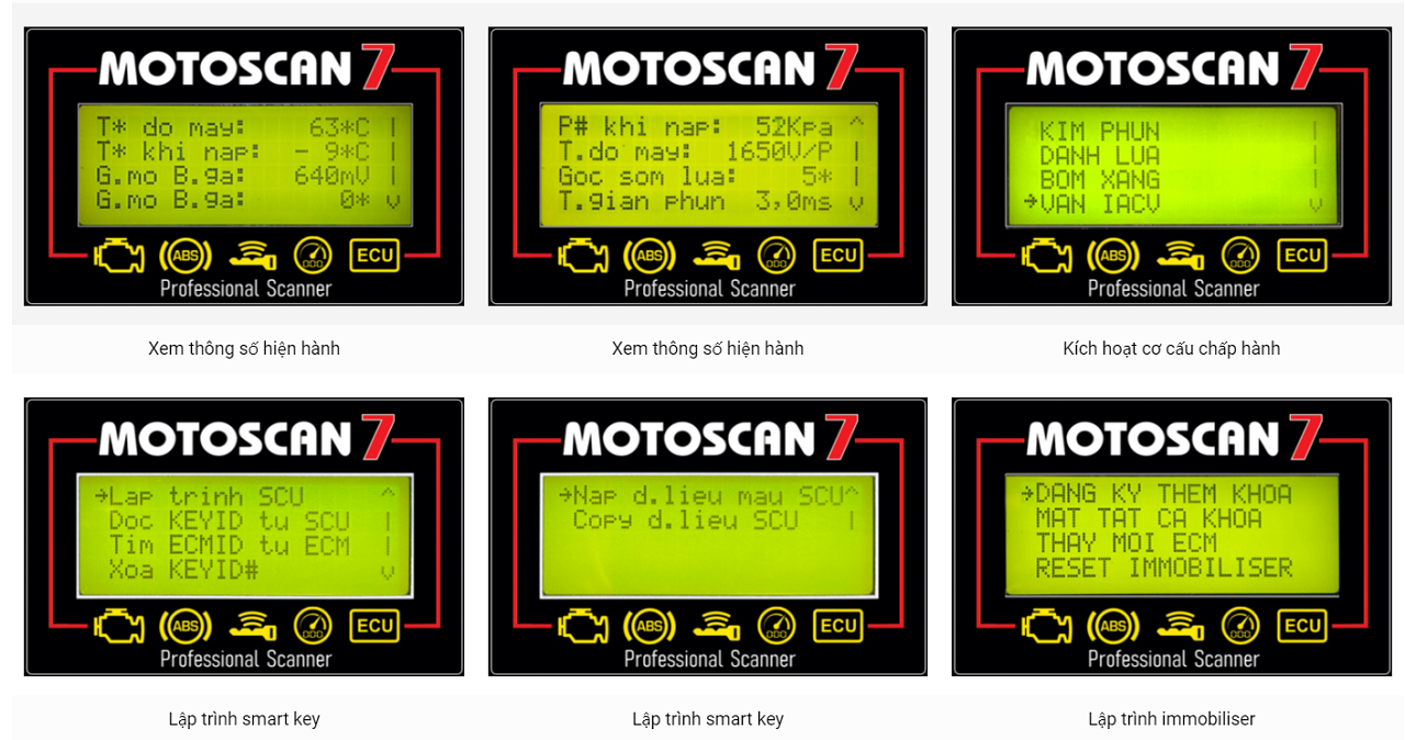 | PHIÊN BẢN CHUYÊN NGHIỆP (mã sản phẩm: MT007F) | MOTOSCAN 7 PRO Hỗ trợ cho 6 nhà sản xuất xe: HONDA + YAMAHA + SYM + SUZUKI + PIAGGIO + KYMCO | 17.300.000 |