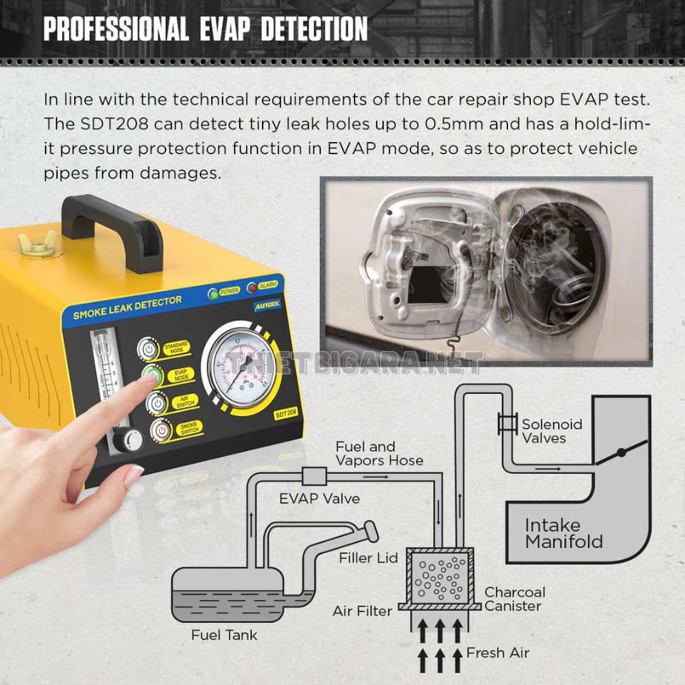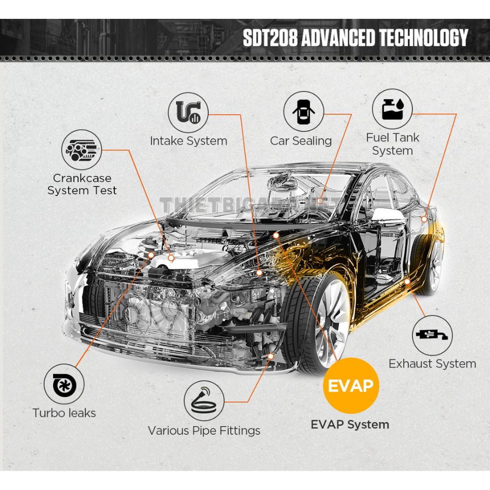 - Phát hiện EVAP chuyên nghiệp với yêu cầu kỹ thuật của bài kiểm tra EVAP của cửa hàng sửa chữa ô tô. SDT208 có thể phát hiện những rò rỉ nhỏ lên đến 0,5mm và có chức năng bảo vệ áp suất giới hạn giữ ở chế độ EVAP, để bảo vệ đường ống của xe khỏi bị hư hỏng.