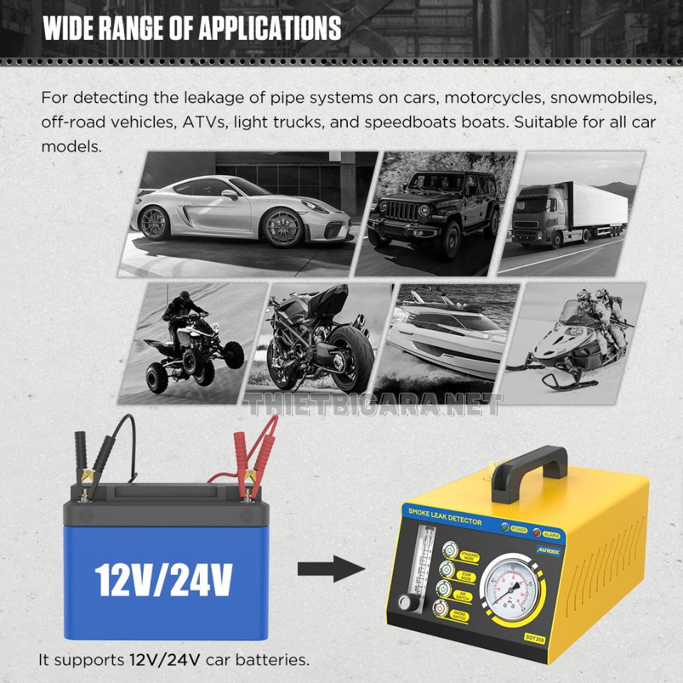 - Máy dò rò rỉ khói AUTOOL SDT208 phù hợp để phát hiện rò rỉ trong ô tô, xe máy, xe trượt tuyết, ATV, ATV, xe tải nhẹ và tàu cao tốc, phù hợp với mọi kiểu máy (đối với 12V/24V DC).