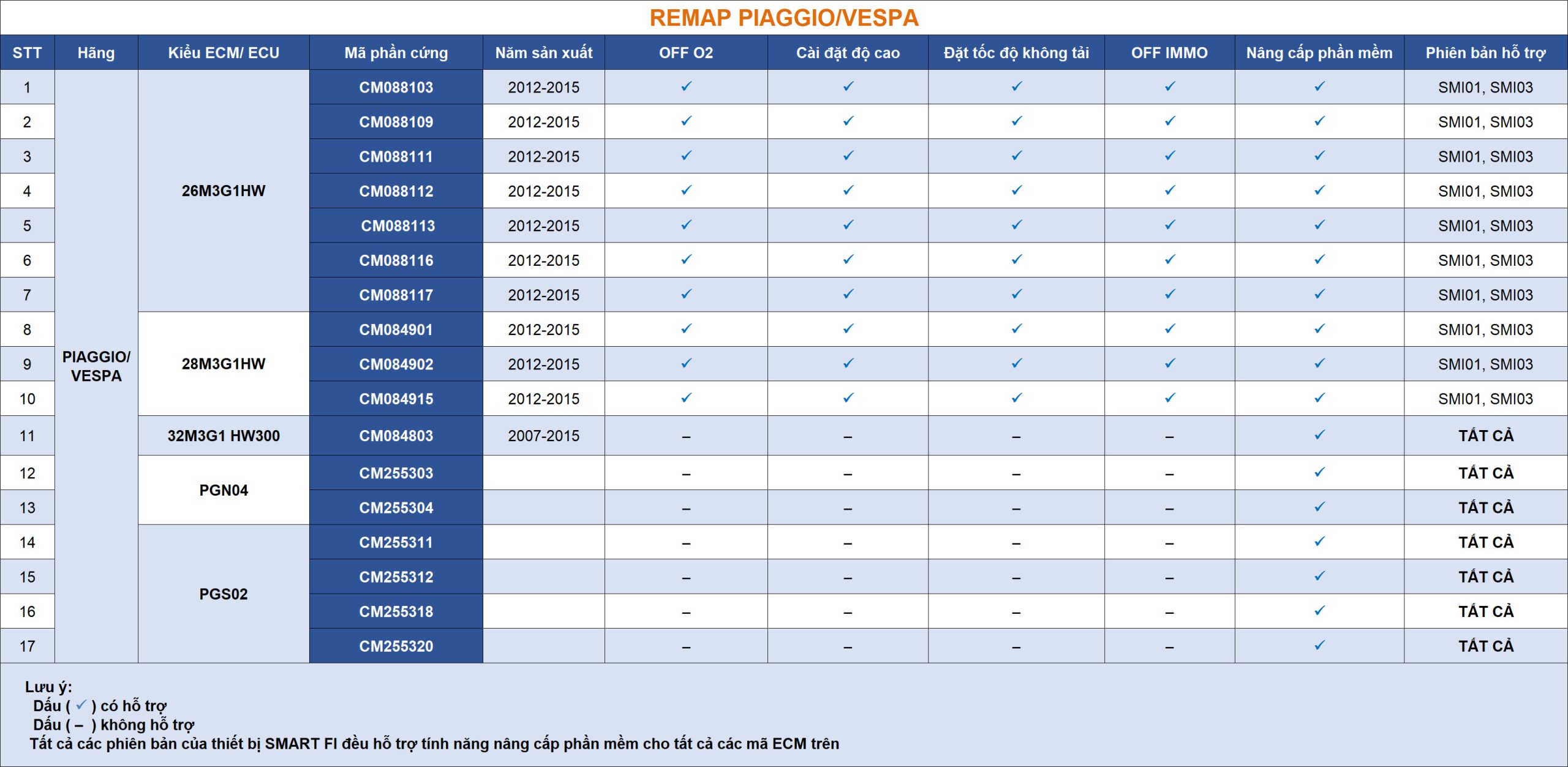- Model SMI03: chẩn đoán lỗi hệ thống động cơ + ABS + nâng cấp phần mềm cho Piaggio/Vespa + Remap, tuning cho Honda sử dụng ECM Shindengen và ECM Keihin (Giá bán lẻ: 8.500.000 VNĐ)