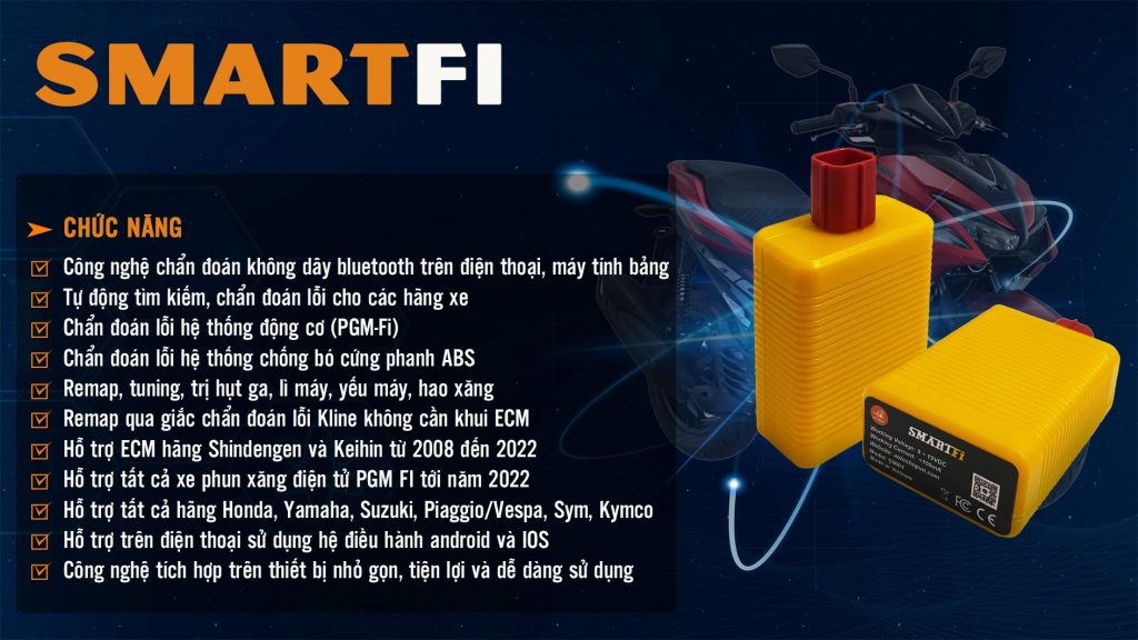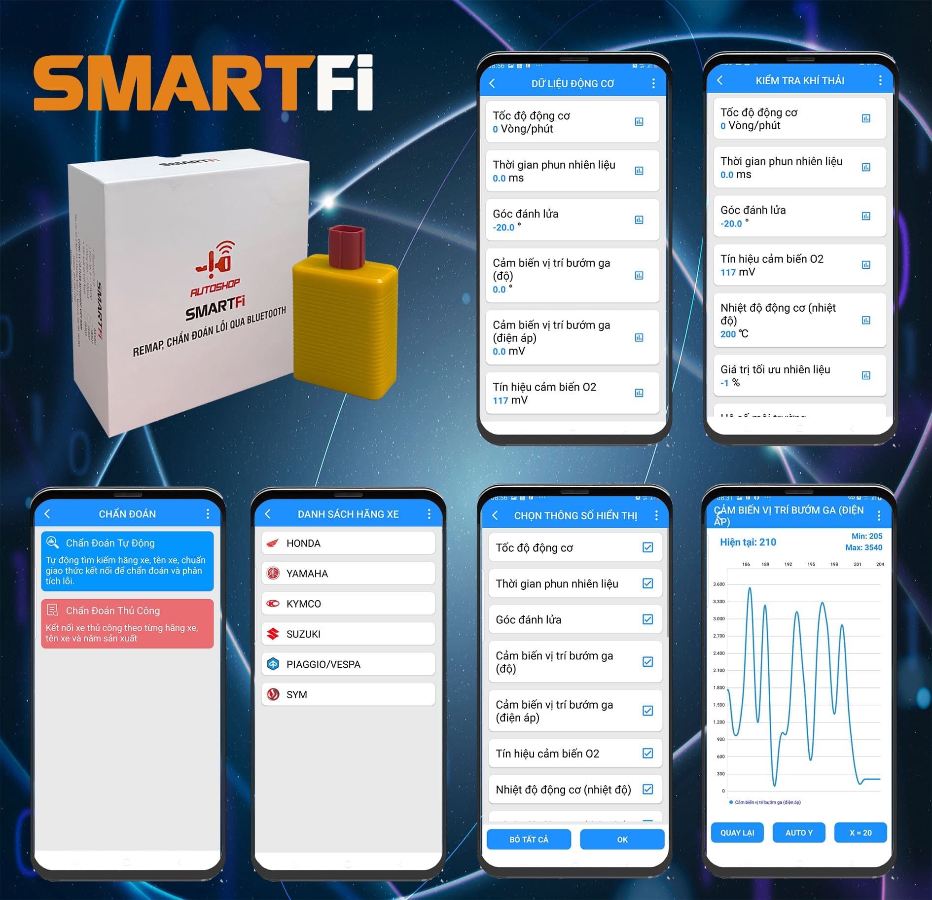 SMARTFi là thiết bị chẩn đoán lỗi (máy đọc lỗi) do công ty cổ phần Autoshop Việt Nam nghiên cứu và sản xuất ra mắt năm 2022. Là một thiết bị nhỏ gọn, tiện lợi, mạnh mẽ và chuyên sâu ứng dụng trong việc chẩn đoán lỗi phân tích sửa chữa và remap tuning cho mô tô và xe máy