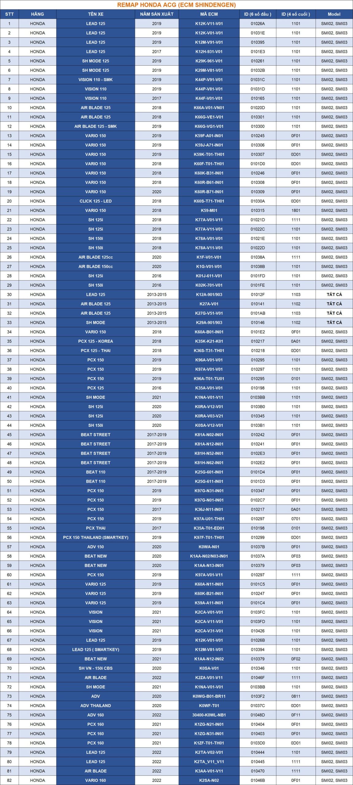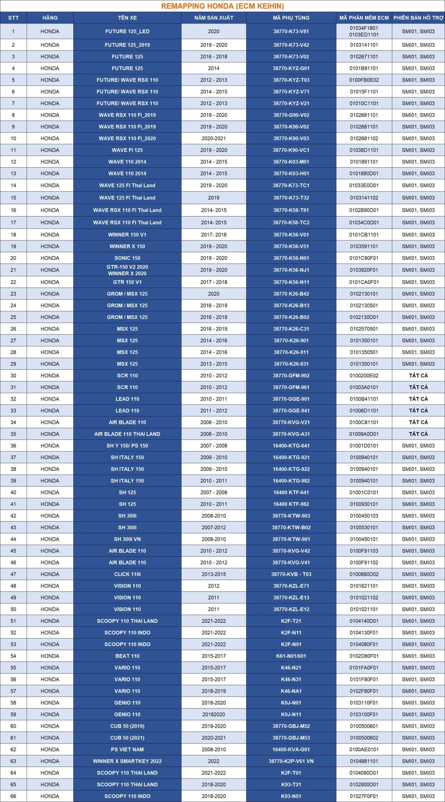 - Hỗ trợ tuning/remap tất cả 84 mã ECU xe Honda ACG (2013 tới 2022)