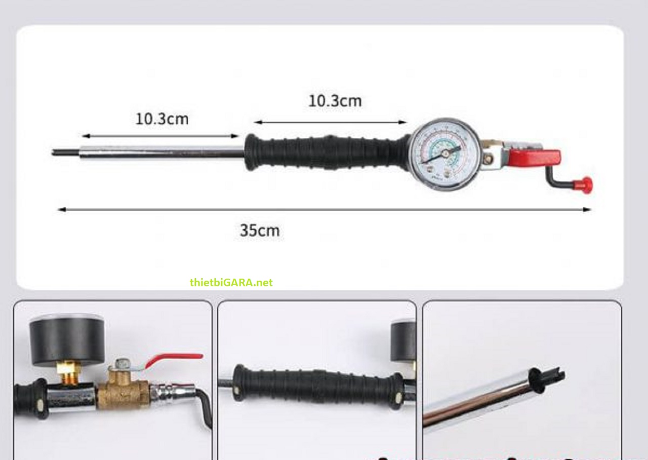 - Khả năng bơm đo áp suất lốp đến 20kg/cm2