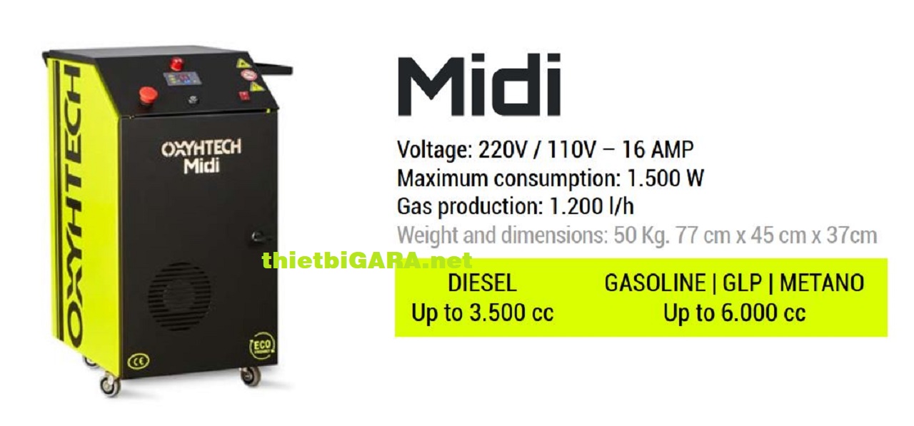 - Oxytech MIDI sử dụng quy trình điện phân hiệu suất cao phân ly oxy và hydro trong nước, trở thành loại khí mới nhất được gọi là orto-oxyhydrogen (thường được gọi là khí HHO hoặc Khí Brown).