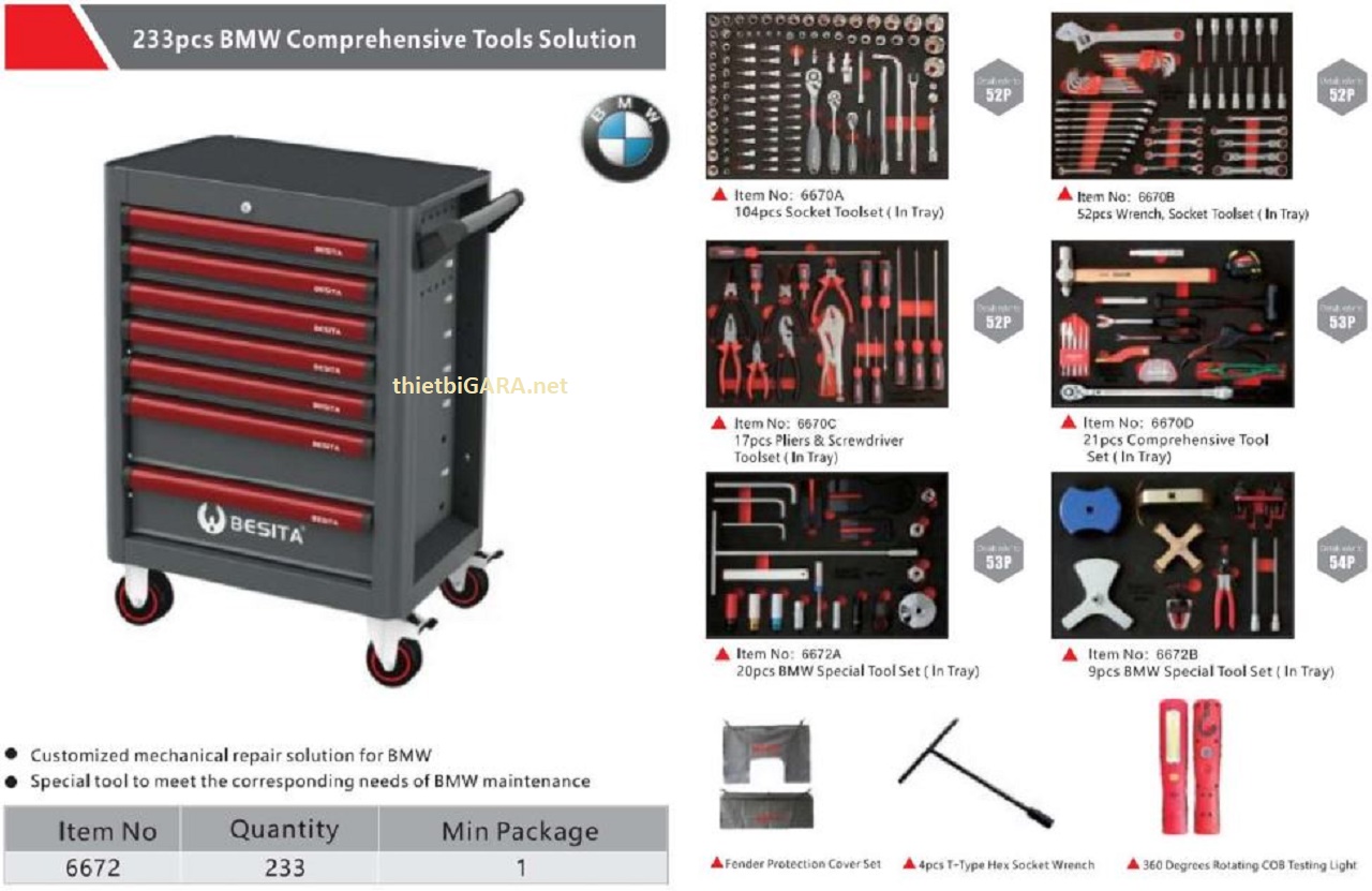 - Với các dụng cụ chuyên dụng cho các dòng xe Đức đặc biệt thương hiệu BMW thì mẫu tủ 6672 của BESITA là mẫu tủ không thể thiếu trong các hãng xe Châu Âu, BMW và gara chuyên sửa chữa dòng xe này.